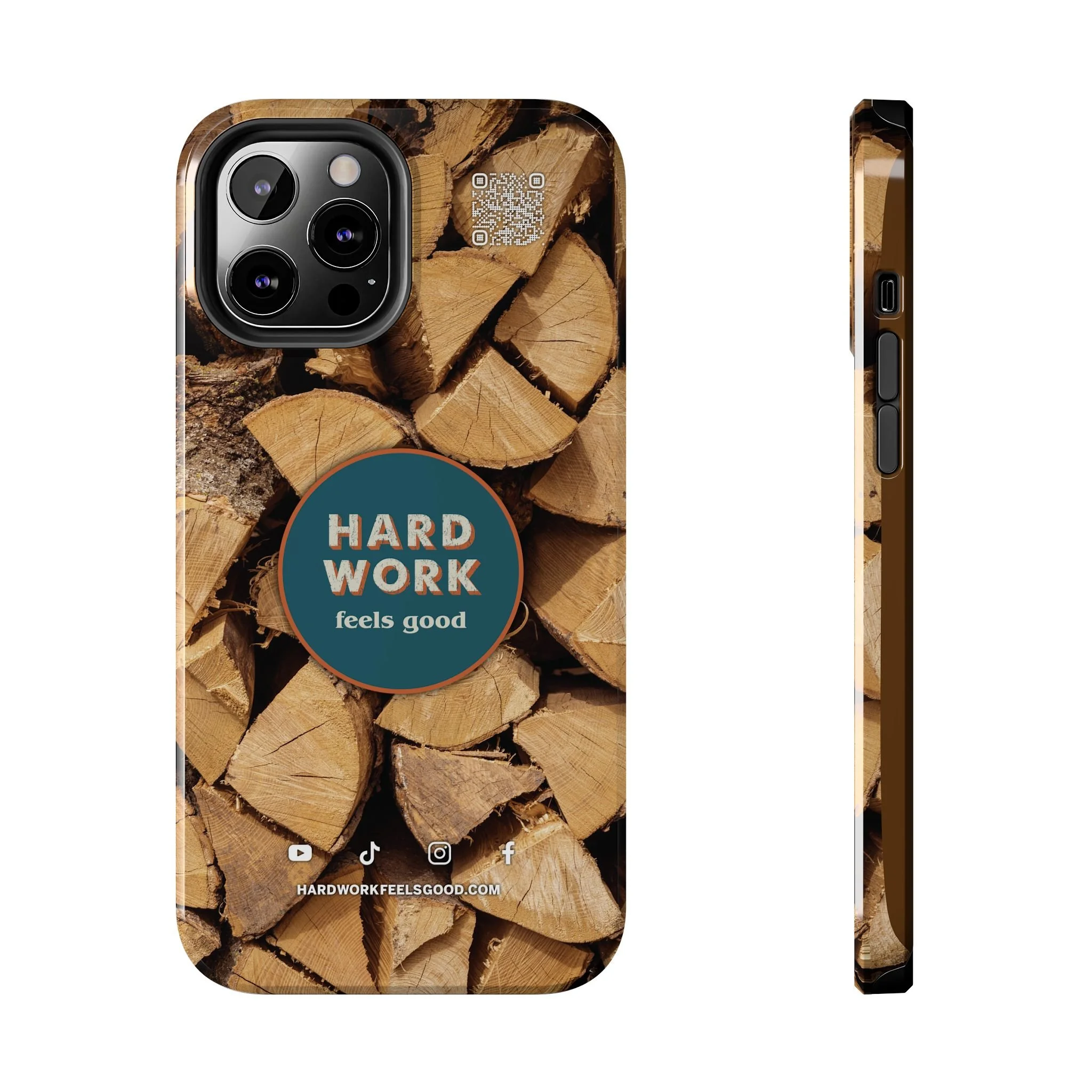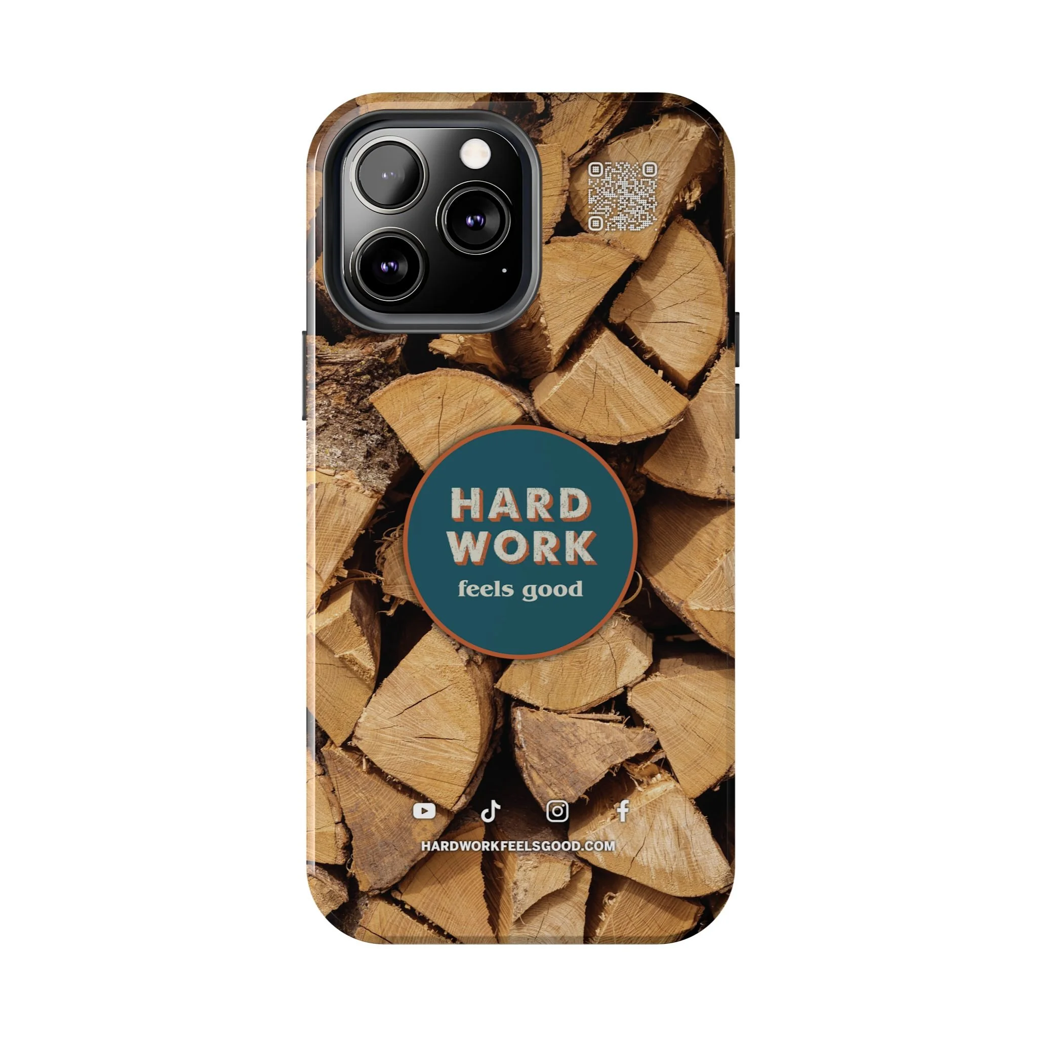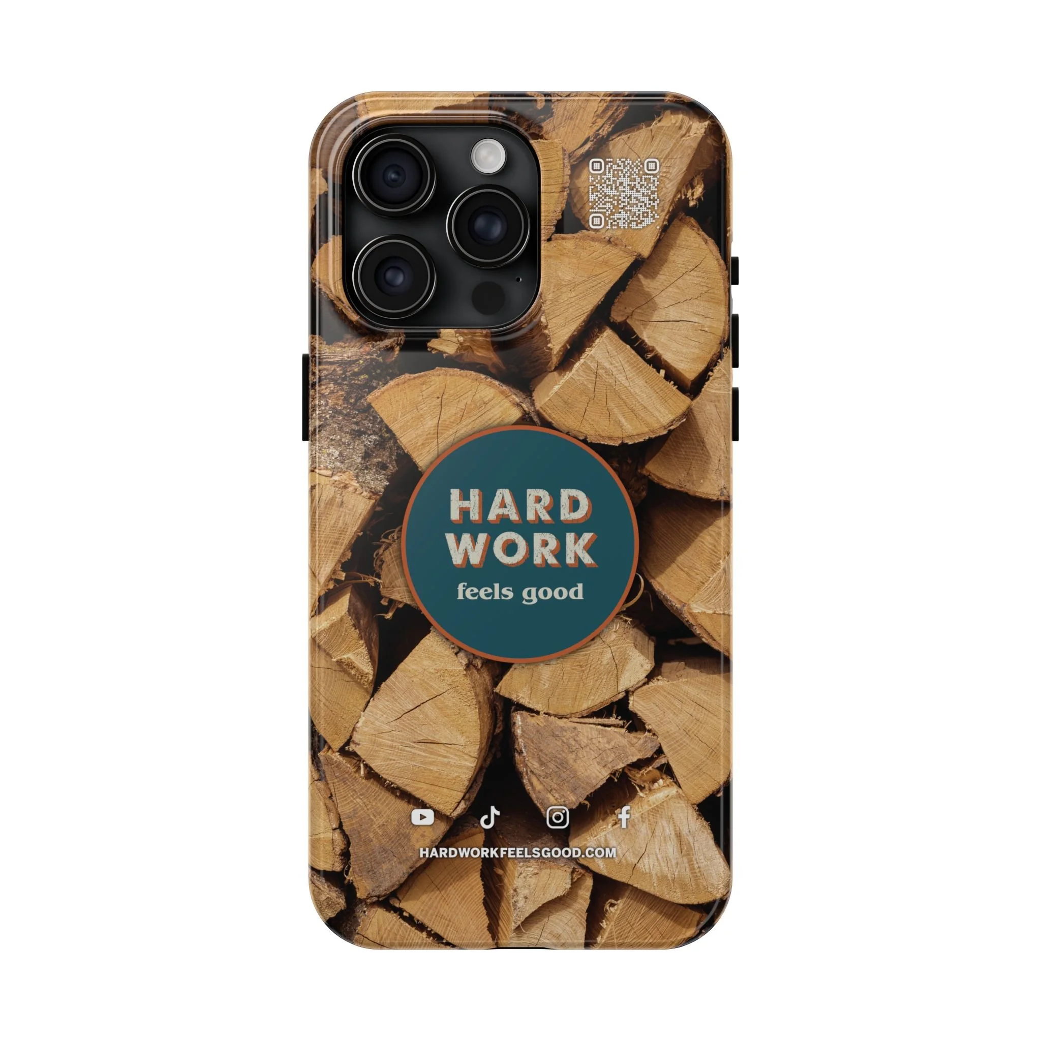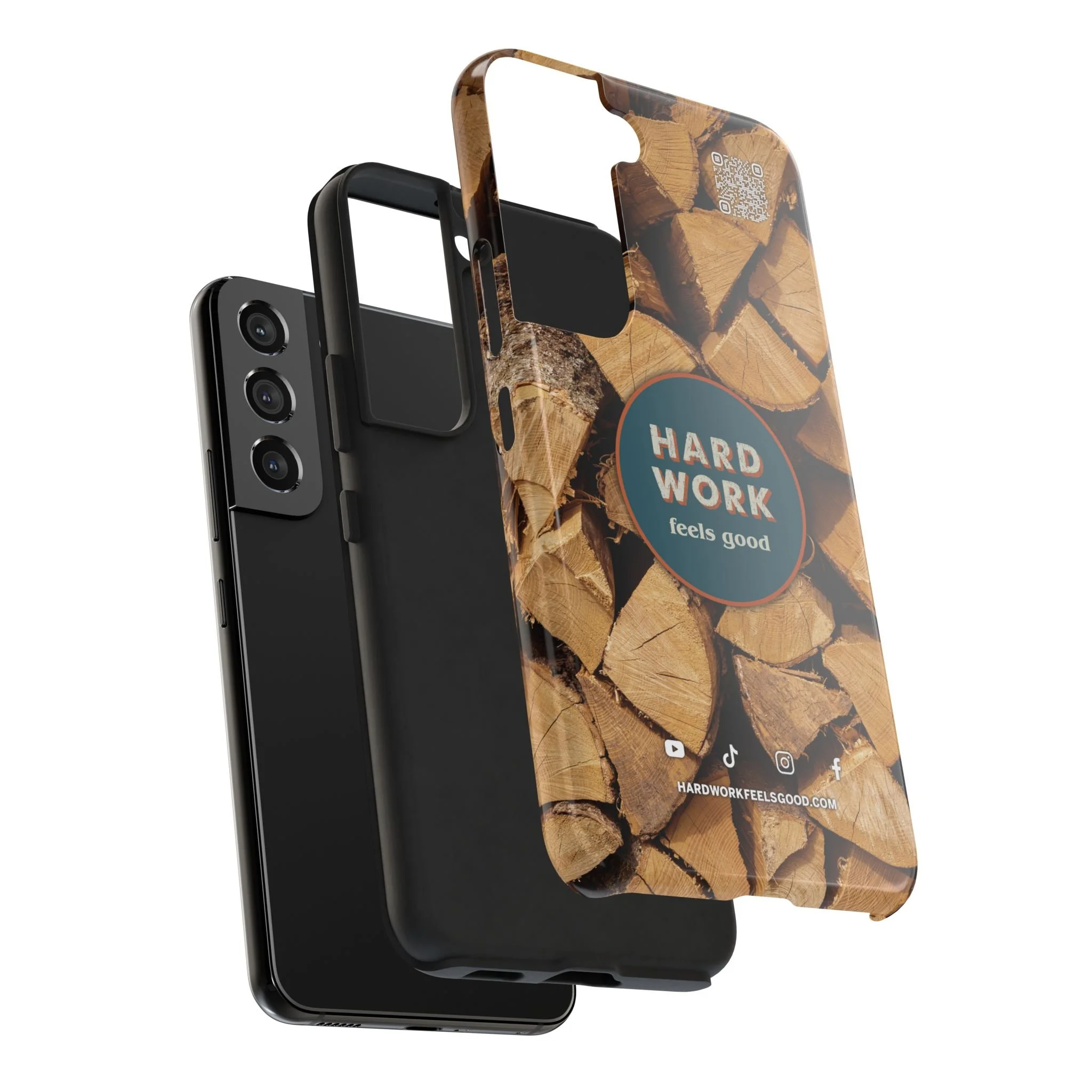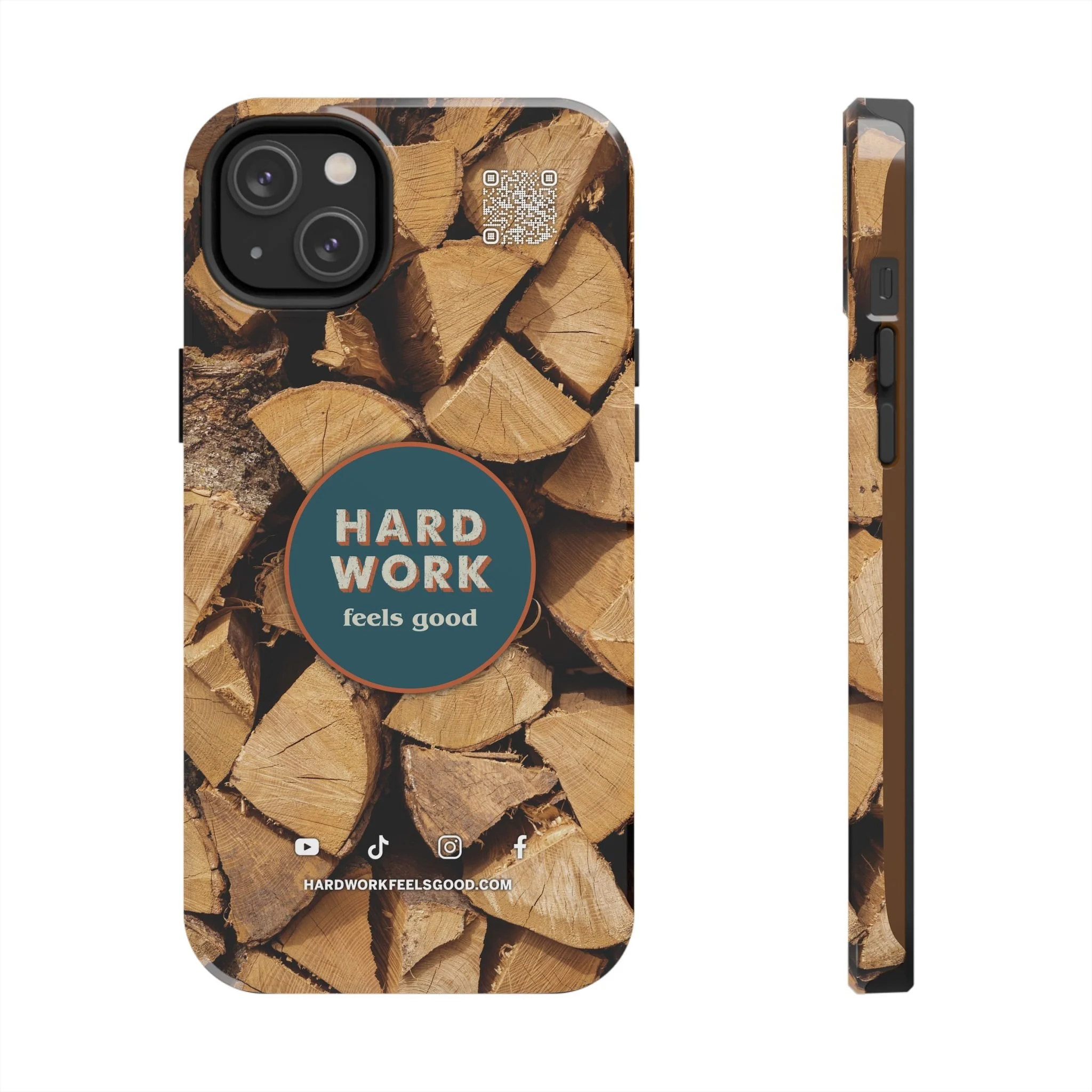 Split, stacked and seasoned wood, with a simple badge that says “HARD WORK feels good.” This phone case brings that same honest, outdoorsy energy to your pocket — a glossy, protective shell that looks like a cabin-side pile of firewood and feels rugged in daily use. Drop it, set it down on rough surfaces, carry it on workdays or weekend projects; the dual-layer construction and interior rubber liner stand between your device and bumps while the raised bezel helps guard the screen. The UV-resistant glossy print keeps the woodgrain deep and rich through seasons of sun and outdoor use. It’s made for people who take pride in getting things done and want their phone to reflect that quiet, steady grit.