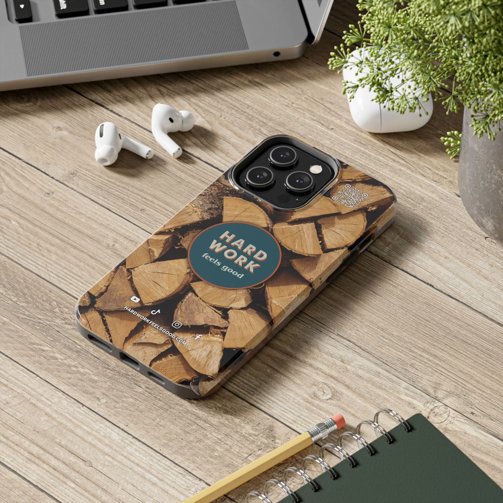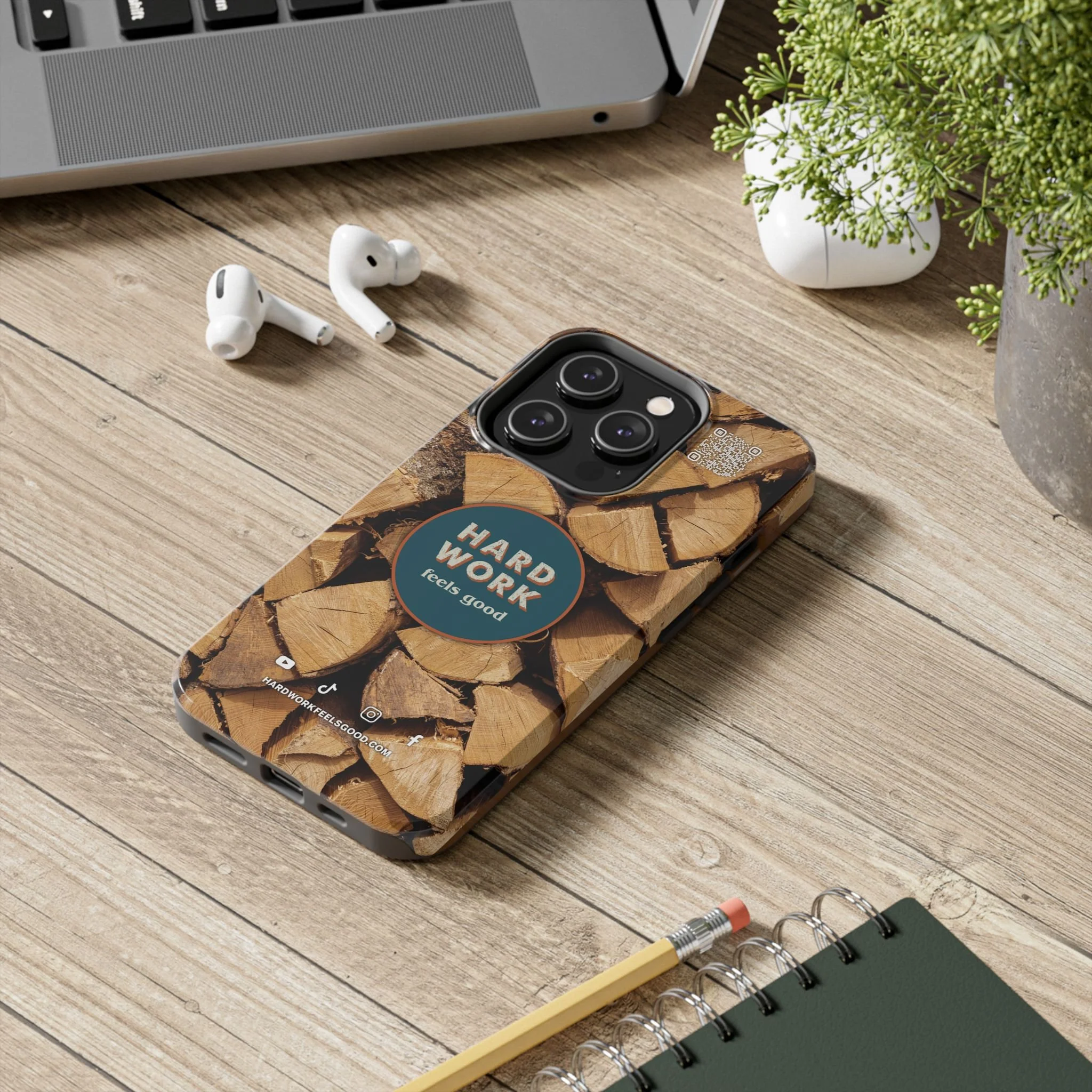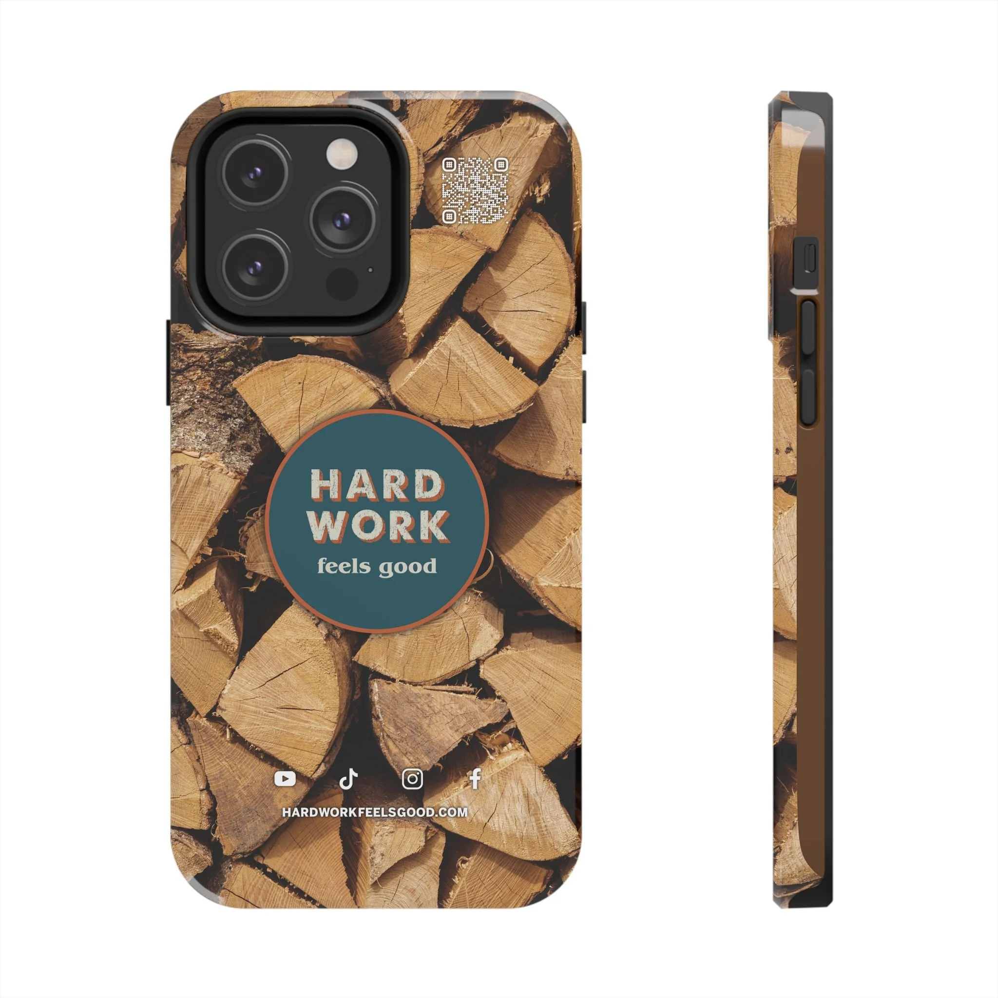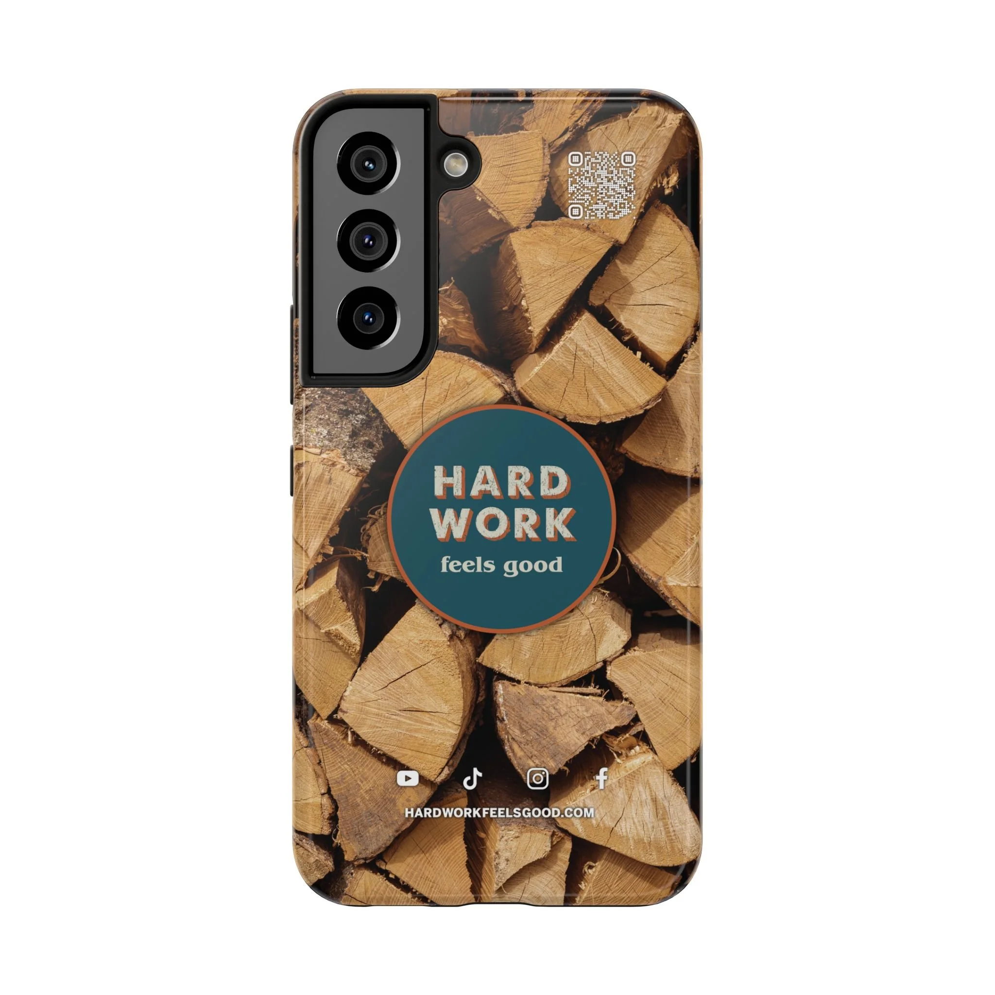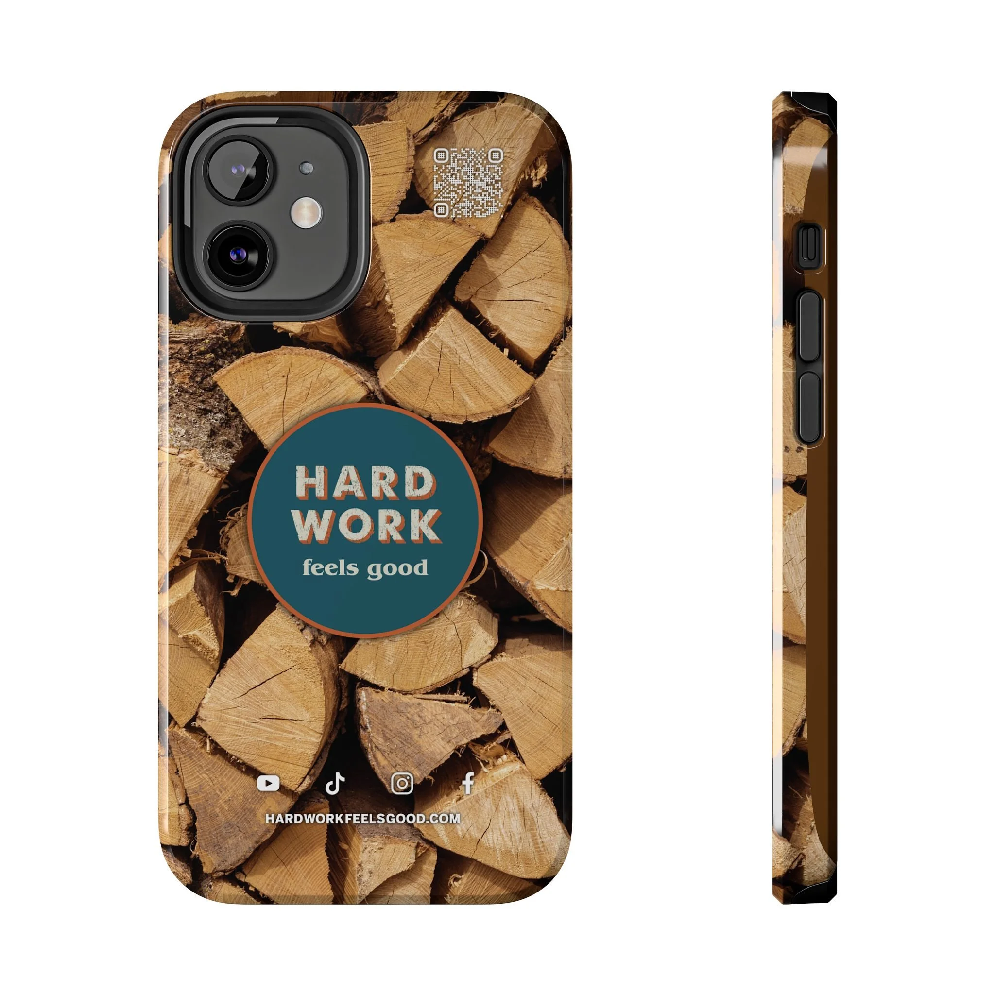 Split, stacked and seasoned wood, with a simple badge that says “HARD WORK feels good.” This phone case brings that same honest, outdoorsy energy to your pocket — a glossy, protective shell that looks like a cabin-side pile of firewood and feels rugged in daily use. Drop it, set it down on rough surfaces, carry it on workdays or weekend projects; the dual-layer construction and interior rubber liner stand between your device and bumps while the raised bezel helps guard the screen. The UV-resistant glossy print keeps the woodgrain deep and rich through seasons of sun and outdoor use. It’s made for people who take pride in getting things done and want their phone to reflect that quiet, steady grit.